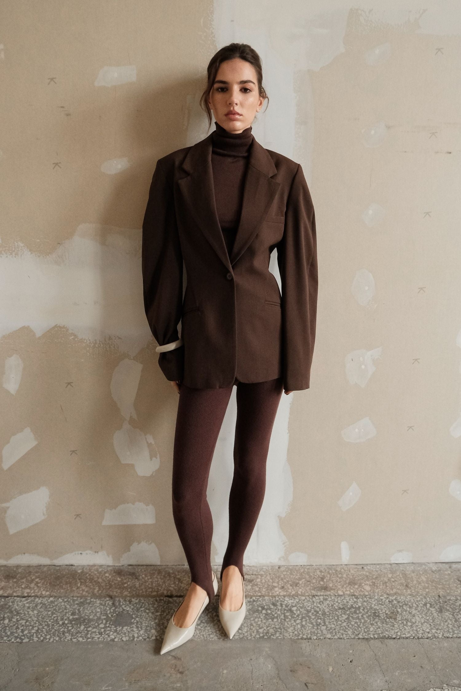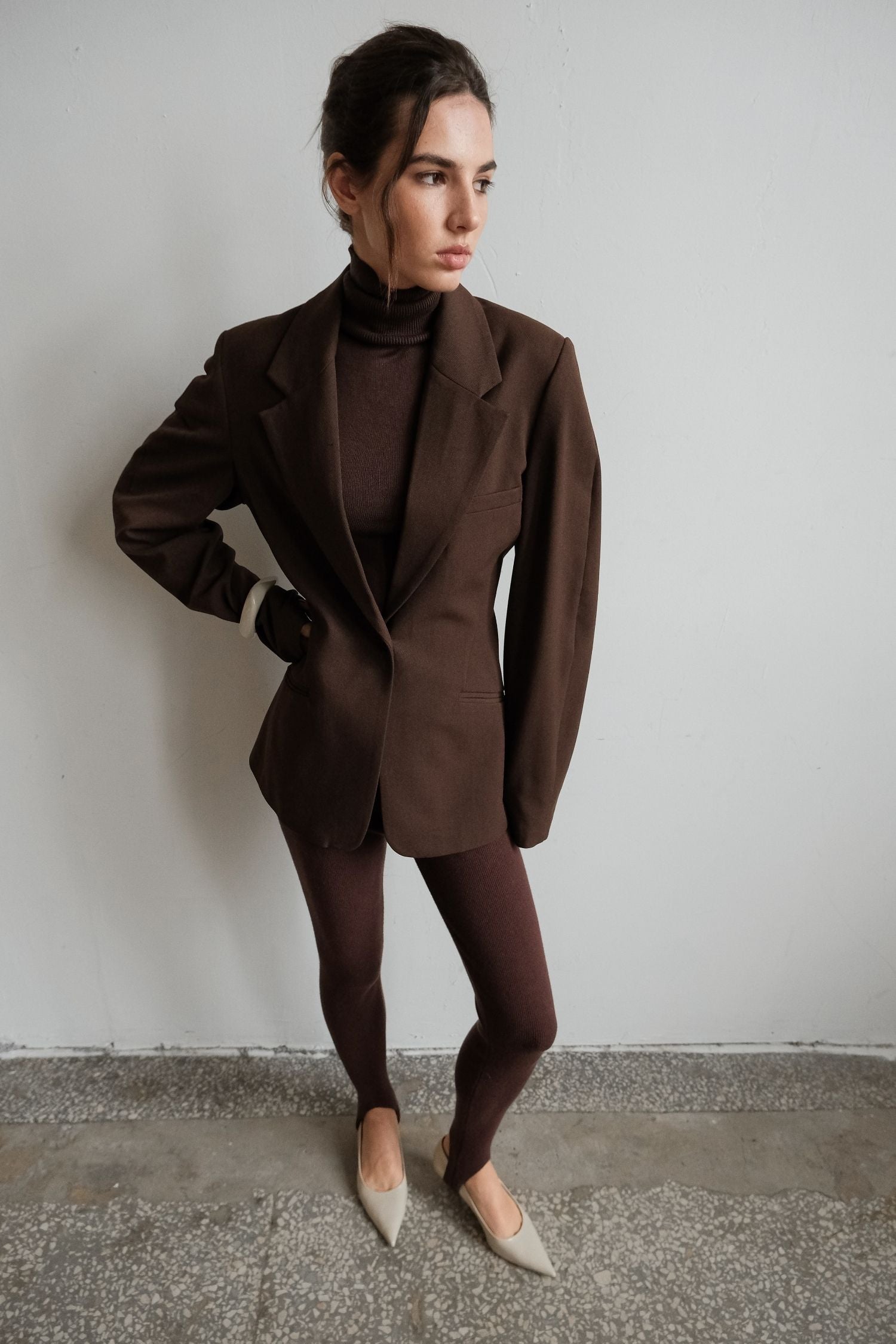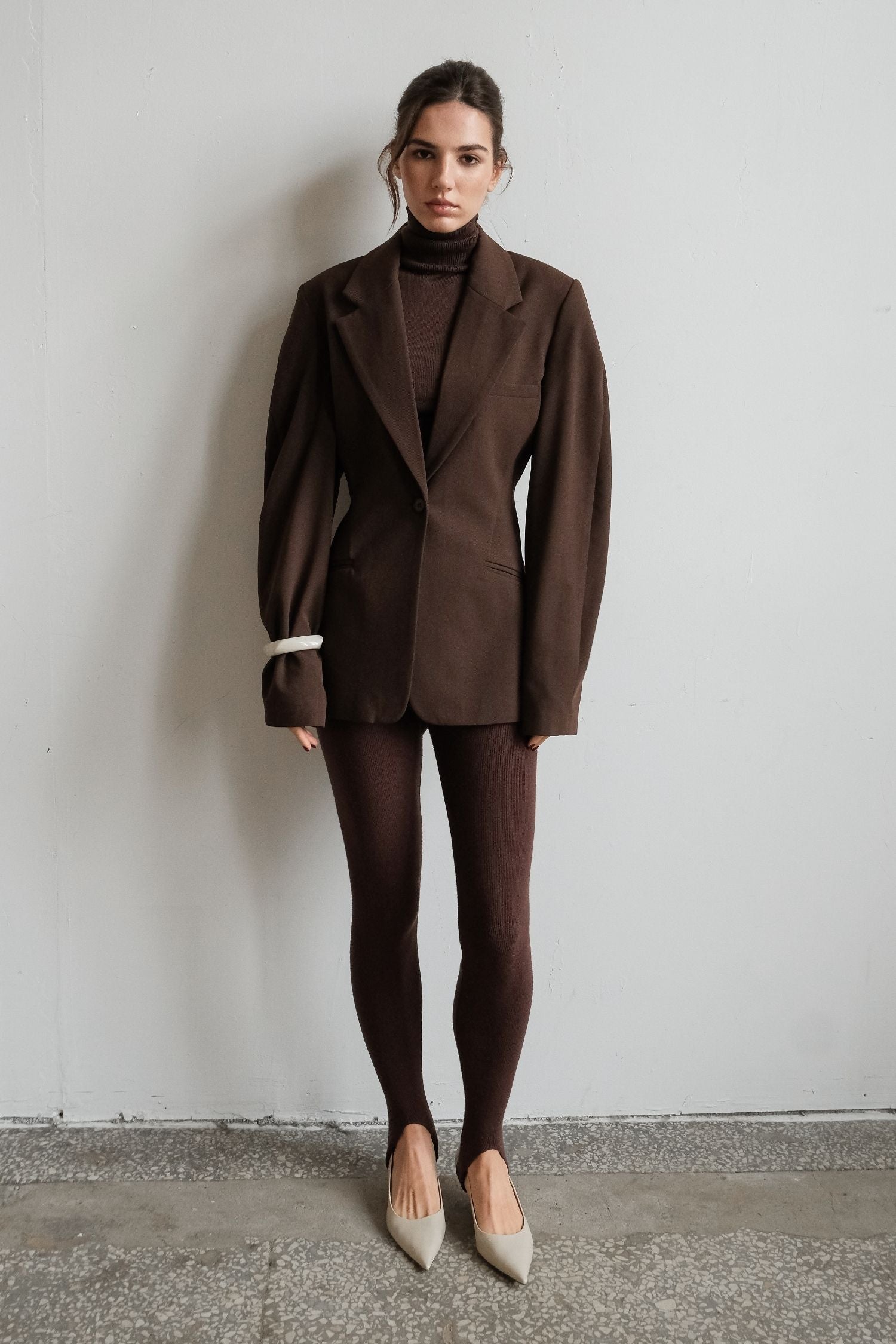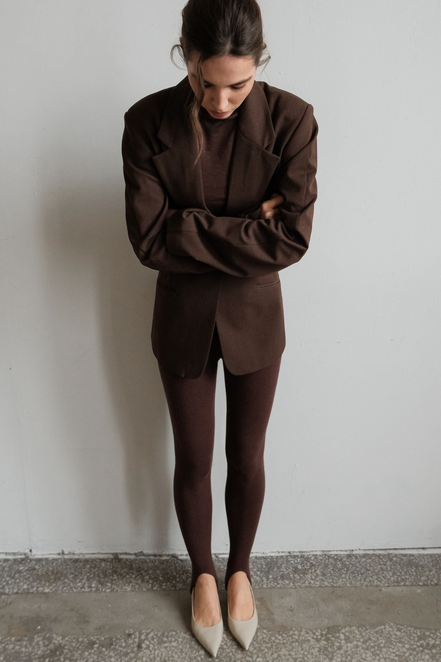 Жіночі трикотажні легінси зі штрипками. Легінси шоколадного кольору, виконані з м’якої та приємної до тіла пряжі. Тепла і максимально зручна модель в актуальному відтінку, що ідеально поєднується зі светрами, сорочкам, джемперами і різноманітними верхнім одягом.