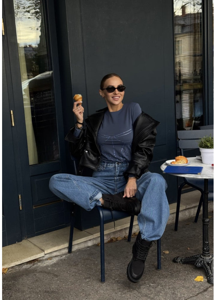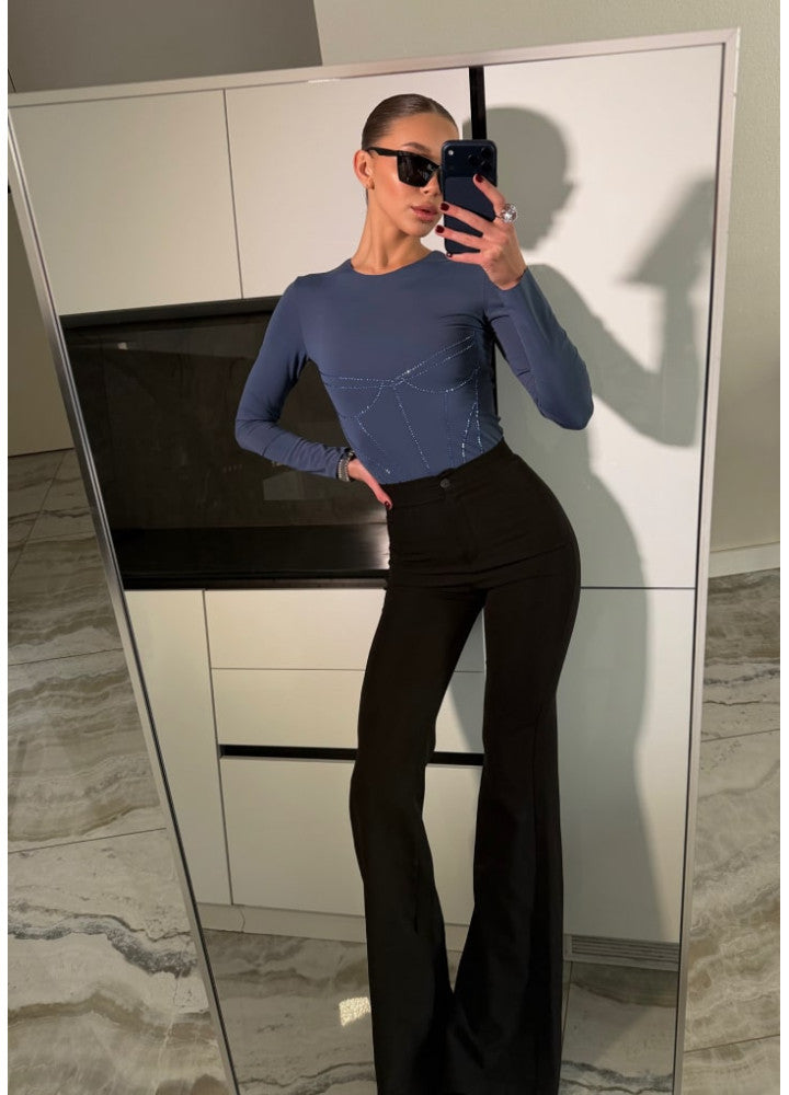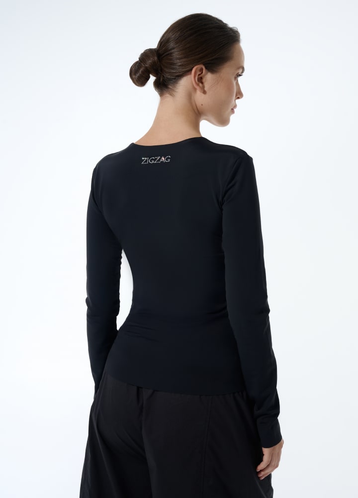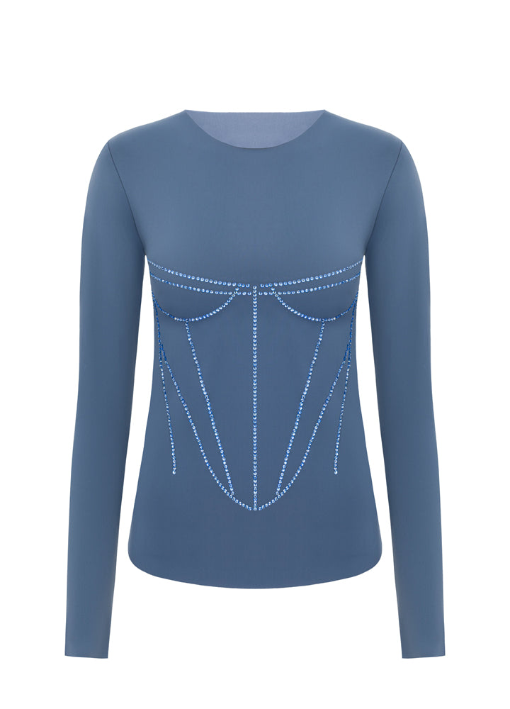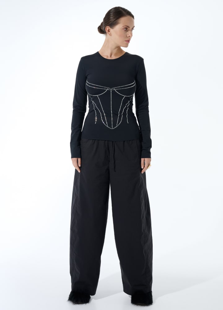 Лонг Кейт приталеного крою з графічним оздобленням у вигляді корсетного силуету. Декор виконано з білих кристалів преміум-якості, . Модель виготовлена з еластичного біфлексу, що зберігає форму та забезпечує комфорт у повсякденному носінні.  Ззаду — фірмова вишивка ZIGZAG.
