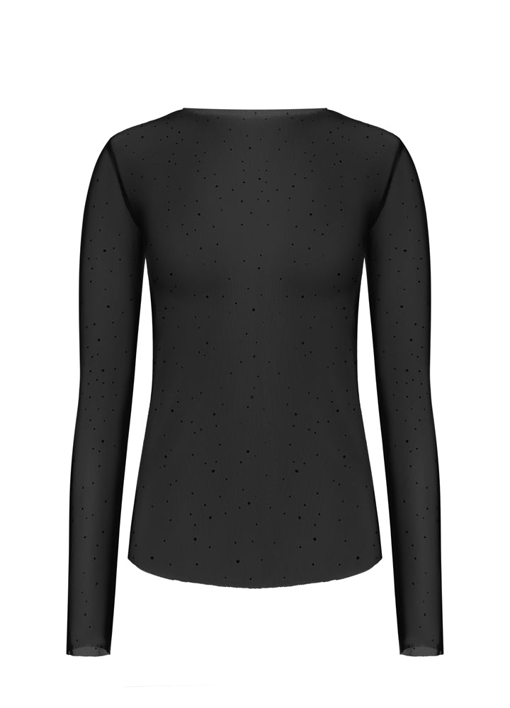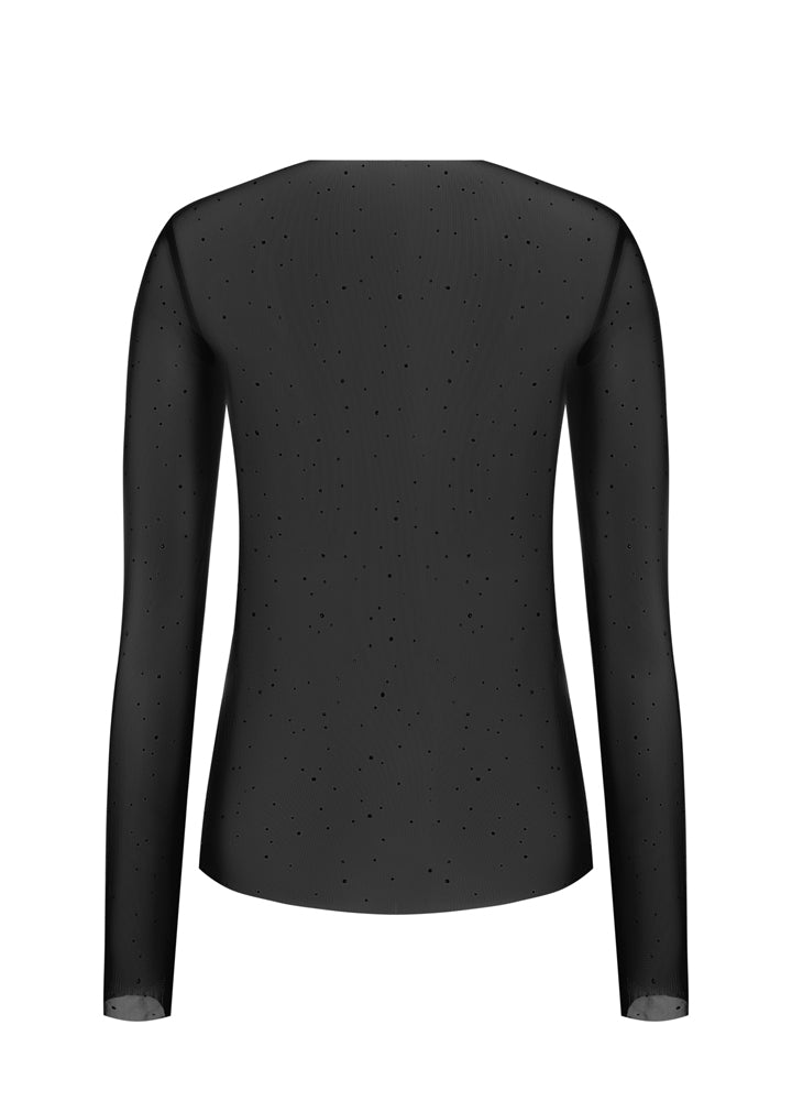 Лонг розсип чорного кольору приталеного крою, повністю інкрустований кристалами з обох боків. Декор рівномірно розподілений по всій поверхні та закріплений методом термопресування, що забезпечує надійність і збереження блиску. Модель виготовлена з еластичної сітки, приємної до тіла та стійкої до зношування.