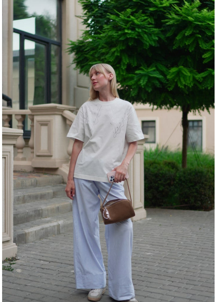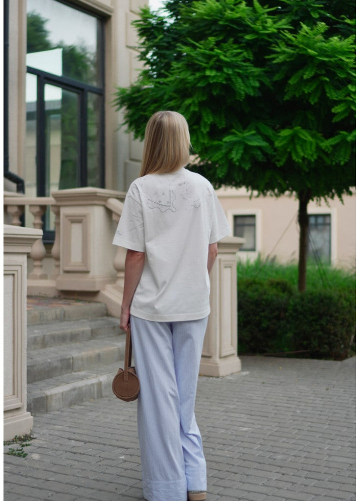 Молочна футболка прямого крою з декором у вигляді комірця. Декоративний елемент розміщено спереду та ззаду, викладений прозорими кристалами преміум-якості. Модель виготовлена зі 100% бавовни. Лівий рукав оздоблено фірмовою вишивкою ZIGZAG.
