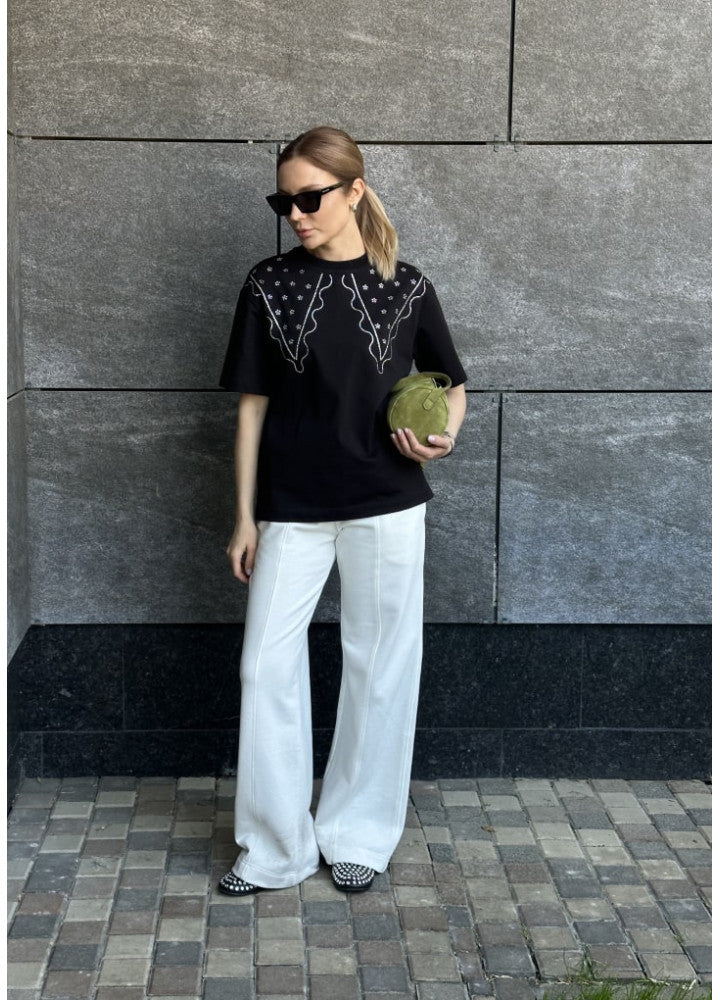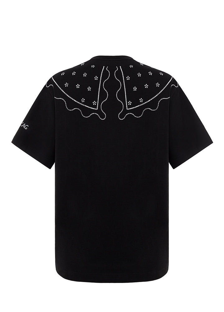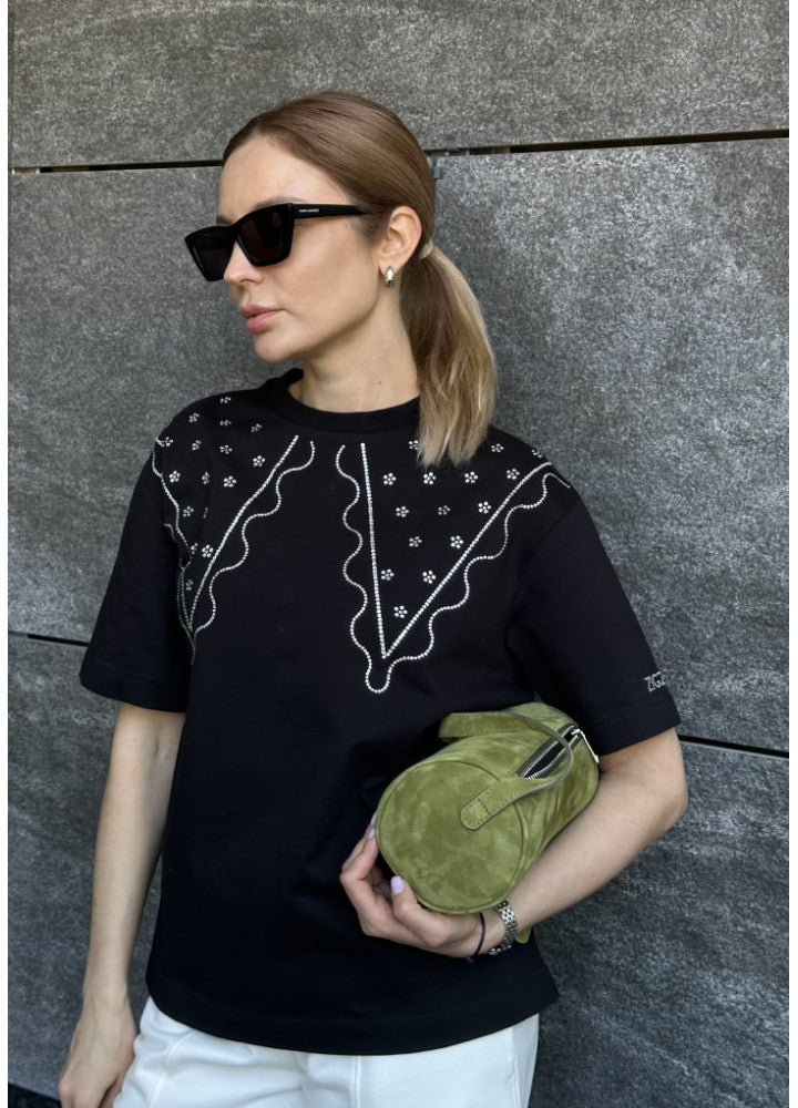 Чорна футболка прямого крою з декором у вигляді комірця. Декоративний елемент розміщено спереду та ззаду, викладений прозорими кристалами преміум-якості. Модель виготовлена зі 100% бавовни. Лівий рукав оздоблено фірмовою вишивкою ZIGZAG.